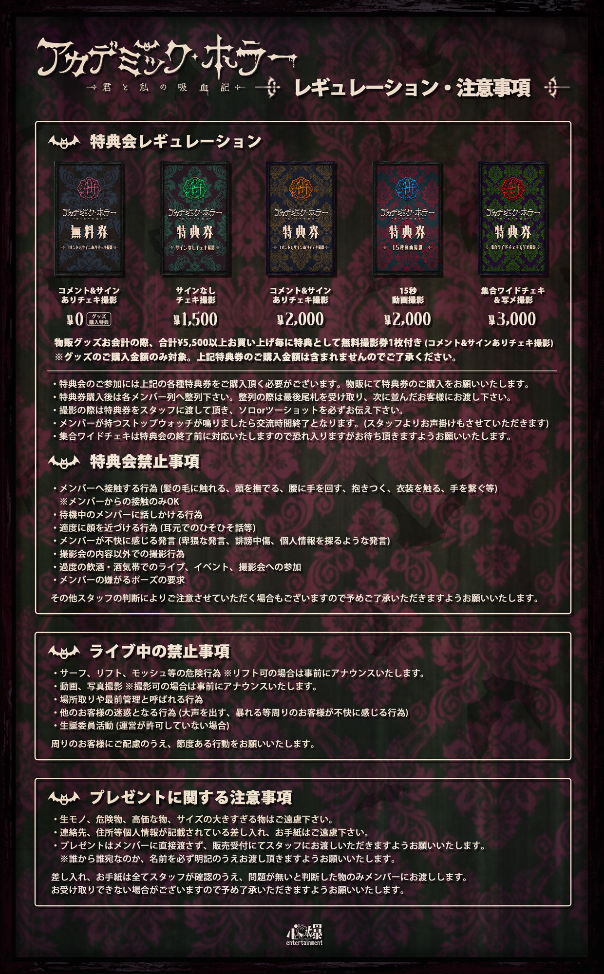 ・プレゼントはメンバーに直接渡さず、販売受付にてスタッフにお渡しいただきますようお願いいたします。(誰から誰宛なのか、名前を必ず明記の上お渡し頂きますようお願いいたします。)